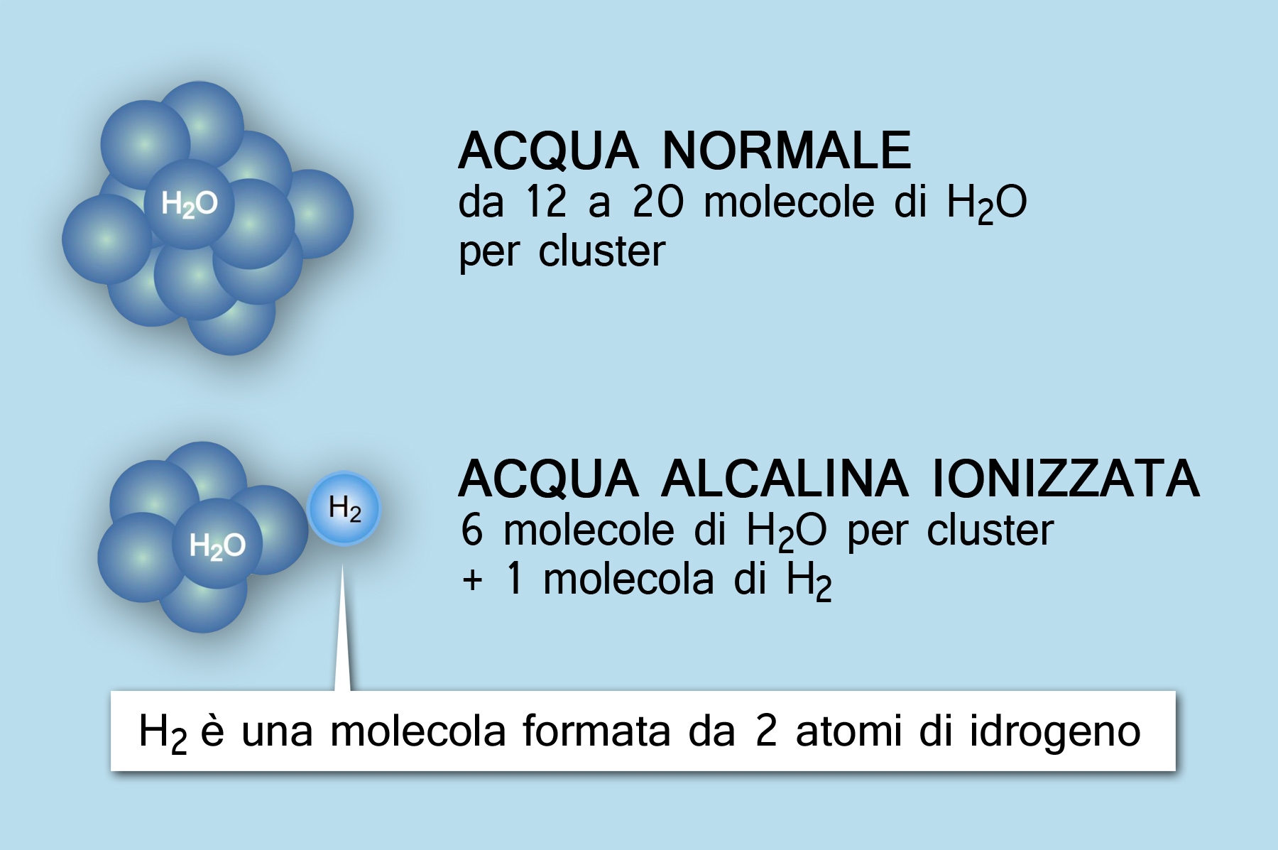 Struttura a microcluster - L’Acqua Ionizzata presenta una struttura più piccola di quella delle altre acque, essendo composta da cluster di quattro o sei molecole d’acqua (rispetto alle solite dieci o quindici). Queste dimensioni significativamente inferiori permettono all’organismo di assorbirla in maniera più facile ed efficiente, espellendo così le tossine da cellule e tessuti.