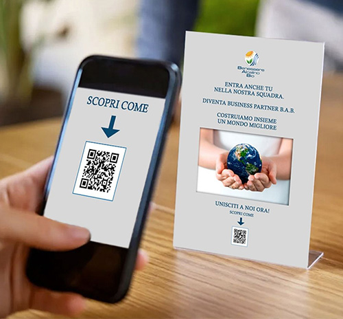 Inserisci un piccolo corner espositivo nel Tuo Punto vendita/locale commerciale, dotato di Flyer con Qr-Code e il Tuo ID personalizzato.