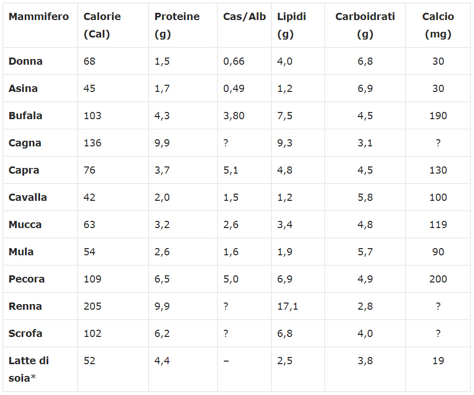 Tabella 1 – Composizione media (valori per 100 g di alimento) del latte di diverse specie di mammiferi (Cas/alb: rapporto caseinogeno/albumina; *: inserito per confronto).