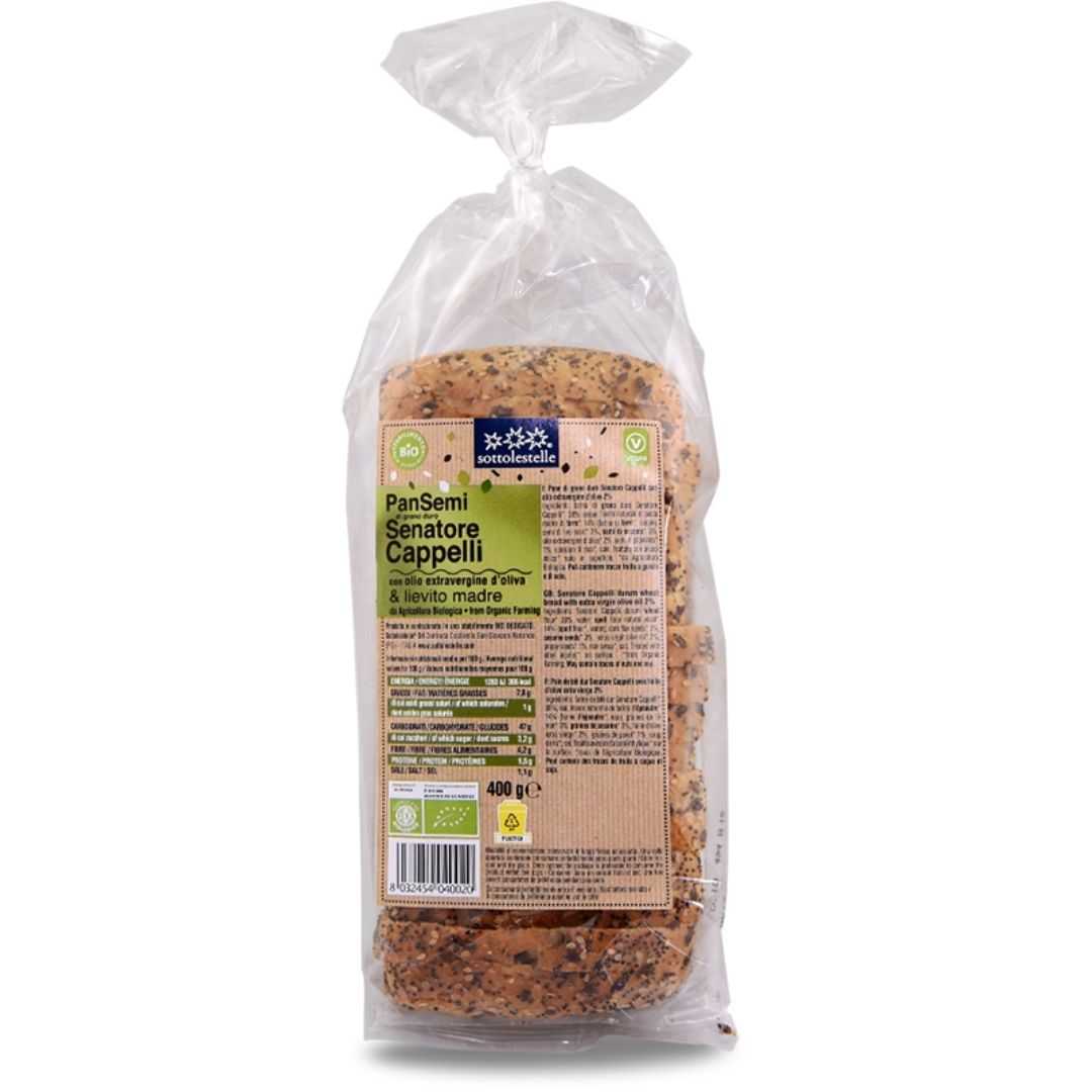 • IngredientiFarina di grano duro Senatore Cappelli* 38%, acqua, lievito naturale di pasta madre di farro* (farina di farro*, acqua) 14%, semi di lino scuri* 3%, semi di sesamo* 3%, olio extra vergine d'oliva* 2%, semi di papavero* 1%, malto di riso* (farina di r